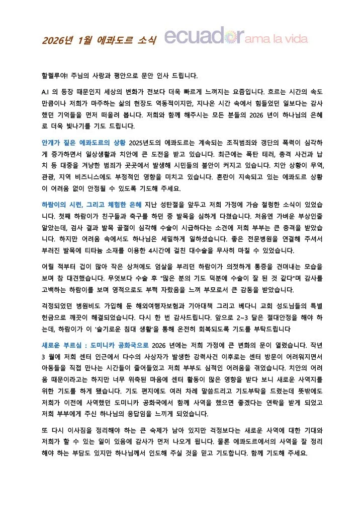 에콰도르의 불안한 치안 상황 속에서도 저희를 안전하게 지켜주신 하나님의 은혜와, 최근 큰 수술을 마친 첫째 하람이의 회복 소식을 전해드립니다.