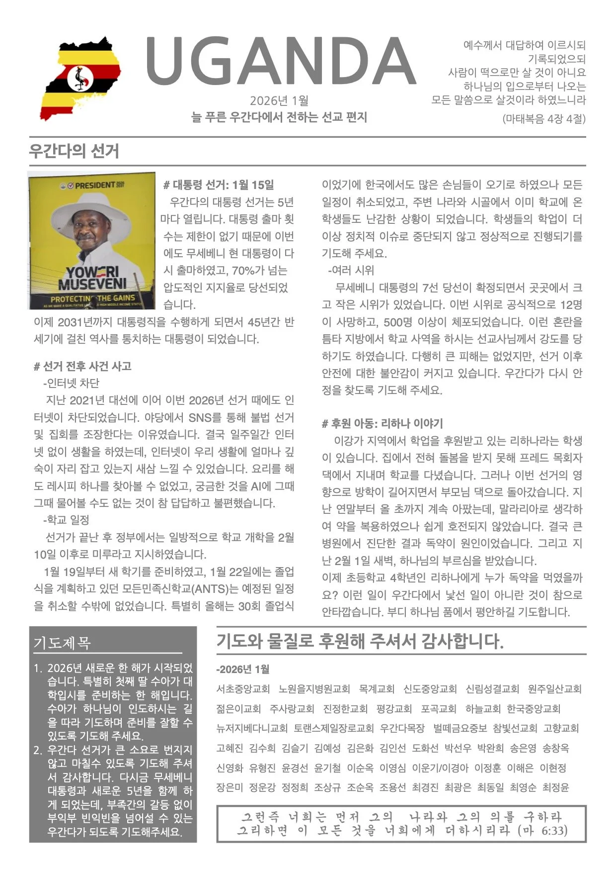 2026년 한 해도 우간다 선교를 위해 함께 기도해 주시고 후원해 주셔서 감사합니다.